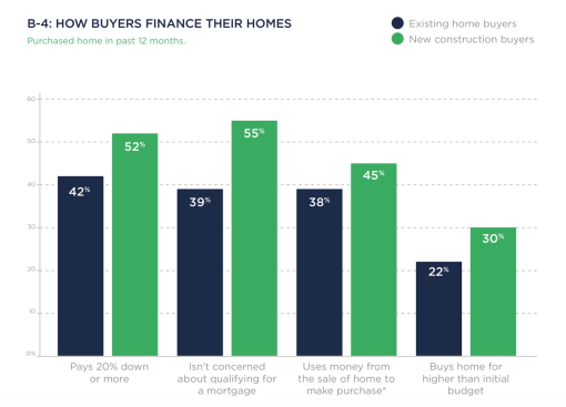 4. Among new construction buyers who used financing to purchase a home, 45 percent used funds from the sale of a previous home to fund at least a portion of the down payment, compared with 38 percent of existing home buyers.