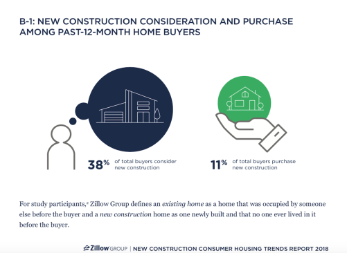 1. Among several home types they consider, 38 percent of total buyers add new construction to their list. Only 11 percent of total buyers purchase a new construction home.