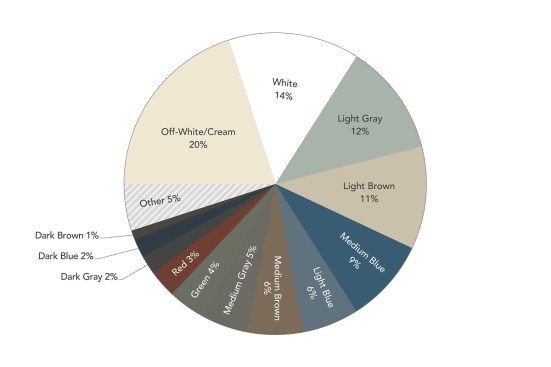 Following off-white/cream and white, light gray (12%), light brown (11%), and medium blue (9%) make up the rest of the top five, while dark brown (1%), dark blue (2%), and dark gray (2%) ranked as the bottom three.