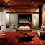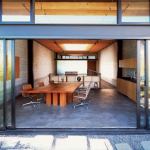 Across the bridge, an oversize walnut door opens to a bedroom/living room and bath. “Crossing the bridge through the atrium is a metaphorical departure from work,” Sagan says. Sliding frosted-glass walls close off the living area from the atrium below. “If we’re there alone at night we open them up and borrow space from the atrium,” he says. “When they’re closed, everything is quiet.”
