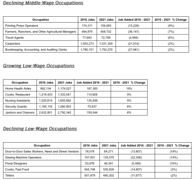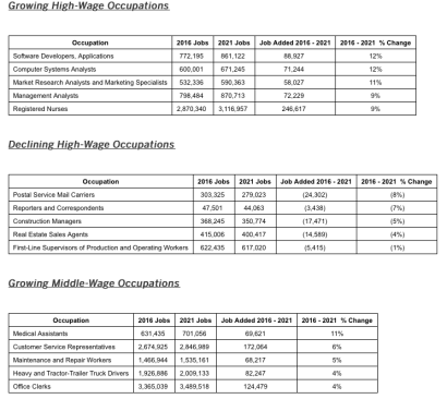 The following is a list of occupations that rank among the top for projected growth or declines in employment for each wage category from 2016 to 2021. Each of the growing occupations listed are those adding at least 50,000 jobs over the next five years.