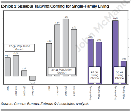 “Over the last five years, 69% [of 35-44 year olds] have chosen single-family living versus just 25% for multi-family. Thus, a 35-44 year old is 2.7 times more likely to skew towards the single-family lifestyle. With outsized growth forecasted for this age cohort at the expense of weakening trends for younger peers, to us, it is clear that demand for single-family housing should outpace multi-family, even after considering any secular trends related to young adults forming families later in life. We do not believe that this is appreciated by the vast majority of housing market analysts and investors.”