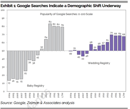 “To gauge pending marriages and births, we compared popularity of searches for wedding and baby registries. Interestingly, the index for both measures has increased substantially over the last three years. For example, in 2016, the index averaged 69 for wedding registries and 80 for baby registries, similar to 2014 and 2015 near the high end of the annual figures. For comparison, these indices averaged 53 and 37, respectively, from 2008-11. This relative improvement is a very important signal from our perspective.”