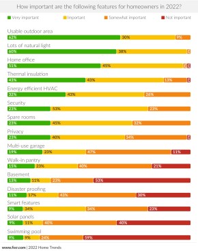 The pandemic shifted the way many homeowners use their homes. As lifestyles and work-from-home scenarios have changed, homeowners’ priorities have adapted with a focus on outdoor space, home offices, and natural light. Fixr.com surveyed 47 home builders, architects, and designers to see what home features are on the radar for essential in 2022.