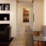 The house’s segmented walls express the floor plan. To the left of a formal foyer is the most public realm—a cozy, art-filled room for intimate wine tastings. To the right, two vestibules lead into a larger living/dining area. This room, where Hobbs hangs out, also can be arranged for corporate events. On opposite walls are a 750-bottle wine refrigerator for displaying sample releases, and a long, slotted fireplace. Full-height pivoting doors flanking the wine fridge lead to a professional-grade kitchen. An office and Hobbs’ bedroom and bath are located behind the kitchen. “The full-height doors continue when you enter the private area,” Backen explains. “You don’t end up coming to a different aesthetic.”