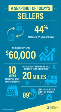 For all sellers, the most frequently cited reason for selling, according to 16% of those surveyed, was a desire to move closer to family and friends, which is the first time this has been the top-cited reason in the series’ history. The next most common reason was that the home was too small, and the third was job relocation at 11%. Sellers typically lived in their home for 10 years before selling it, an increase from last year’s share, and elevated from the historical tenure of six years.