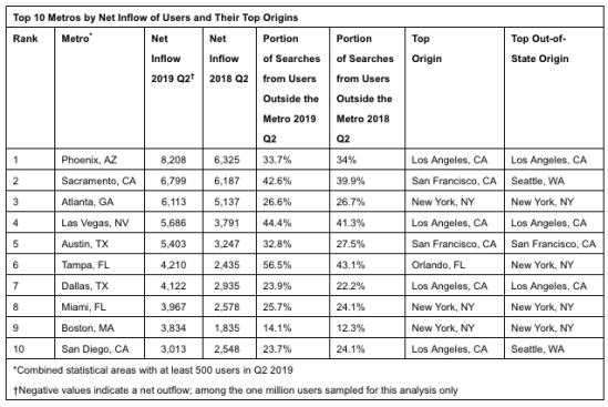 The latest migration analysis is based on a sample of more than 1 million Redfin.com users who searched for homes across 87 metro areas from April through June.