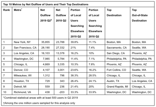 The list of metros people most-often looked to leave was once again topped by New York, San Francisco, Los Angelesand Washington, D.C. in the second quarter. Net outflow is defined as the number of people looking to leave the metro minus the number of people looking to move to the metro.