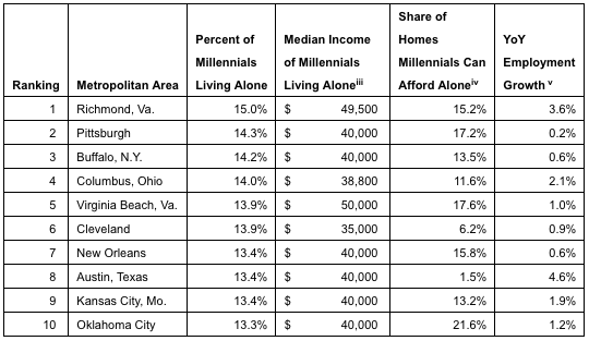 There are, however, still places across the U.S. where millennials are living independently. Richmond’s strong labor market – employment is up almost 4% during the past year – and relatively high incomes among millennials help. The median yearly income among millennials in Richmond is $49,500, which allows them to afford to live in 15% or more of all rentals in the area. In Oklahoma City, 13% of millennials live on their own, and with a median income of $40,000 a year, these Okies are able to afford almost 22% of homes.