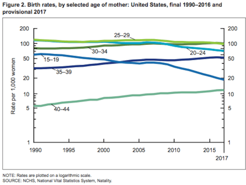 This is the third annual decline in a row, and 2017 also saw a record low fertility rate of 60.2 births per 1,000 women aged 15-44. The only group to see birth rates rise was women in their early 40s—the birth rate for teenagers was down a whopping 7%, meaning the teen birthrate is now down 55% from 2007.