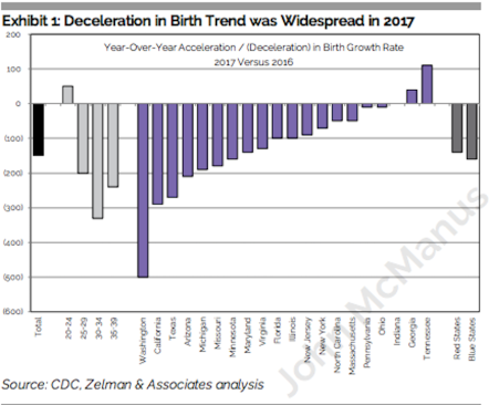 Declining American birth rates are not news, but the latest–provisional–data on fertility from the National Center for Health Statistics came to light as somewhat of a shocker, especially as tidings of jobs, employment trends, and wages evidence a robust economy, full of momentum.