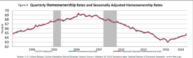 Take a look at this chart on homeownership rates from the U.S. Census. Now, using a straight edge or a steady hand draw a line from left to right, starting with the verticle axis at the just-under-65% mark, straight across to the right-hand verticle axis at the just-under-65% mark.