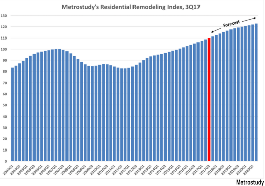 “Big-ticket remodeling activity nationwide rose 1.2% in the third quarter from the second and 4.8% from 2016’s July-to-September period, hitting a new high, according to Metrostudy’s latest Residential Remodeling Index (RRI) released today.