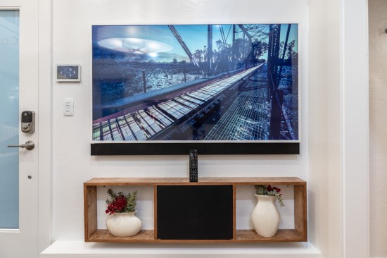 With the press of a button or voice command, lighting, music, and shades adjust to suit different moods and activities. In the kitchen, saying, “Alexa, turn on ‘Cooking’,” sets the room to the ideal light and comfort level for kitchen prep. At the door, press the “Away” keypad button to close the shades, shut off the interior lights, lower the thermostat, and switch on exterior lights. In the loft bedroom—where the window shades are out-of-reach— visitors can hit “Blinds Up” or “Blinds Down” to adjust shading.