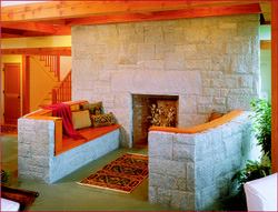 Coarsely split granite forms the fireplace surround and two perpendicular benches that embrace this massive inglenook. “You clearly feel the armature of the stone cradling you,” says architect Mark Hutker. The seats extend 6 feet 5 inches beyond the firebox opening, so that just about anyone can fully stretch out next to a fire. The granite’s random ashlar pattern is countered by smooth polished fir that lines the stone seats, while ample cushions add comfort and coziness. Exposed fir beams outline the 8-foot ceiling just above the alcove, which soars to a peaked vault in the living room beyond. The chimney wall and sides of the inglenook also serve as dividers in an otherwise open sequence of public spaces.
