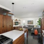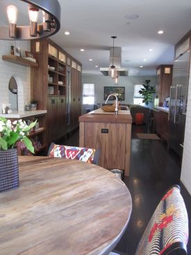 The room’s main workspace is set between a window wall and a 30-inch-wide island that includes a four-burner gas cooktop, quartz and walnut counters, and a roll-away component that also serves as a table for kids and guests.