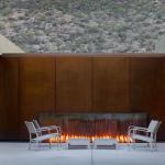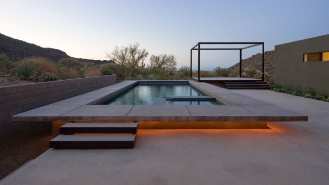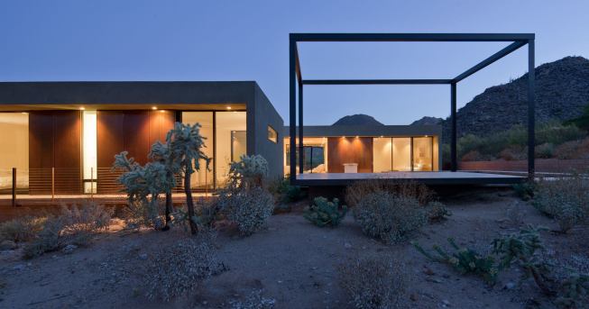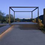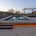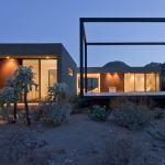 The cube has a steel armature that can be covered for shading, but so far the clients have preferred to leave it as a stark object. “It really gives you a sense of being in the wide open desert but with a sense of enclosure,” Rosano describes. The location on the property’s far southeast corner means it gets early sun, but not prolonged western exposure. A concrete base absorbs heat during the day and radiates it back at night. The steel frame focuses the view, making this a great spot for dinner under the stars while gazing at far-off city lights.