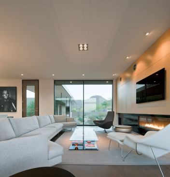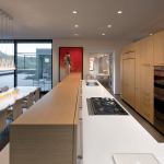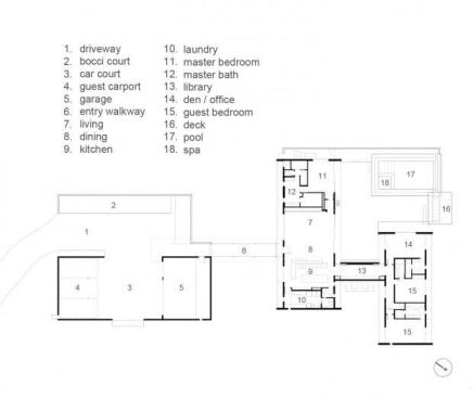 “The volumes are staggered,” Rosano says, “so from the living room you can see past the guest wing to the pool.” A narrow library connects the two parallel bars plus provides shade and privacy for the adjacent courtyard. Ceiling heights were kept low to generate subtle horizontal forms that don’t overwhelm the landscape. This move also allows for better control over the sun through the use of overhangs. Another benefit of this low-slung form is that from the outdoor areas occupants can see over the top of the house to the ridgeline beyond.