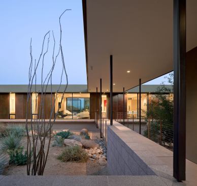 Building a new house in the fragile desert landscape requires thought and precision. Contrary to the stereotype of barren land covered in endless sand, deserts contain a colorful variety of plants and animals. Tucson, Ariz., natives Teresa Rosano and Luis Ibarra, founders of Ibarra Rosano Design Architects, understand the inherent beauty that should be treated with extreme care when building in virgin desert settings. One recent project required a particularly delicate approach. “This site was bisected by a drainage channel that connects to the main wash for the area,” explains Rosano. “Separating the cars from the house via a bridge allowed us to keep that channel intact.”