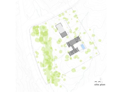 Outdoor spaces are minimal to let the indigenous landscape be the standout views. A simple concrete pool deck links the cozy courtyard with a floating cube on the periphery of the site. “When we first went out to the site, the clients didn’t think they had much of a city view,” Rosano says, “but we went back with a ladder and realized that if you’re just a few feet higher then distant views get much stronger, so the cube allowed us to have an elevated platform where you can see the city.”