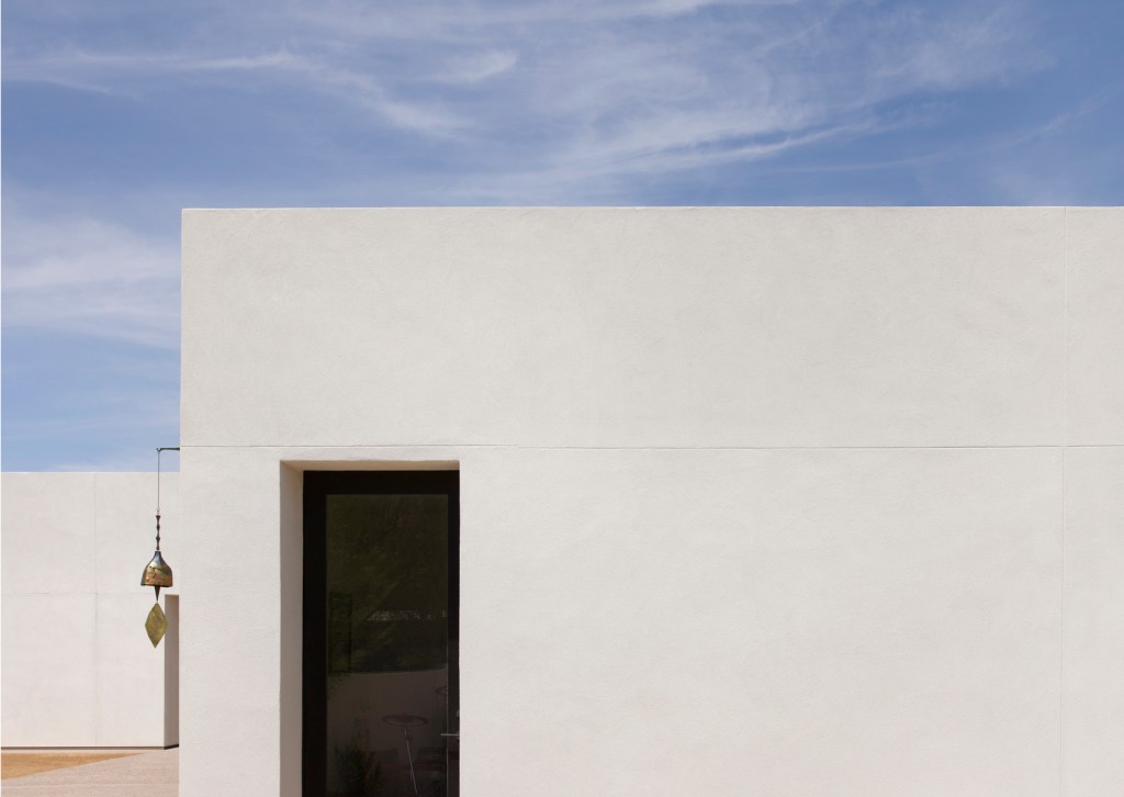 Inside the walls, a bar-shaped, single-story house runs north–south on the site. To its west side, a landscaped entry court features native plantings and serves as seating for a quiet retreat. To the east, a planting-lined terrace connects via a sliding glass wall to the kitchen, living, and dining areas inside, which increases the usable space for much of the year. Next to the terrace is a pool area that runs parallel to the house and past the master suite.