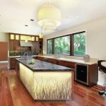 Off-the-shelf material like 3-Form resin panel embedded with birch twigs can be backlit for a striking island that provides seating, a work area, ambiance, and a memorable kitchen centerpiece.
