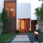 A pivot door gets a special—and a spatial—assist from a slatted wood wing that warms up the modernist look of the outside. The added element embellishes and shelters the entry at the same time. What’s more, the wing helps the front door appear wider and more substantial than it really is in relation to the elevation.