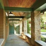 A hinged gate and limestone bench help define a side entryway to a home, turning it into a loggia that’s as welcoming as the front way in, with a gently sloped ramp that makes it wheelchair-accessible. Stone columns, painted trim, and a tongue tongue-and and-groove ceiling give this circulation space extra-special presence.