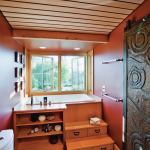 The 18-inch-deep bathtub is a drop-in standard model from Kohler that fits in a 5-foot alcove. The bath area is built into a window bay that cantilivers out into the garden. Stepped Douglas fir cabinetry in the Asian tansu style makes the most of a small room, adding storage space as well as visual interest.