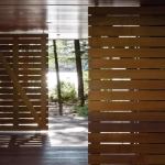 A pair of slatted barn-door style partitions allows for natural light and breezes through the back entry of this family retreat, providing a gentle transition from the main home to a trail that leads to the lake beyond.Project: Lakeside Camp, Boston area; Architect: Tom Murdough, Boston area