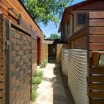 Even the walkway to the carport can be a beautiful space, as evidenced by this Austin, Texas, home, which incorporates a gate of woven raw steel and a metal-clad sliding barn door. Project: Private Residence, Austin, Texas; Architect: Gregory Thomas, Jacksonville, Fla.