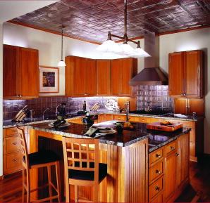PHOTO: Builder/designer: JP Malone Construction, Scottsdale, Ariz. Mark Boisclair Photography backdrop delineates the mod kitchen/family room. “The clients collect modern art,” says Butler, “so they wanted to do something fun that harmonized with their collection.” Custom stainless panels cover the walls to create a “kitchen within a kitchen.” The quilted panels are outlined in smooth strips that align with a suspended steel light fixture. Brushed steel laminate ceiling tiles complete the metallic theme. “We were trying to emphasize what a serious machine for cooking the kitchen is,” says Butler. “It’s like the entire work station has a big stainless steel oven hood over it.” Builder: Paragon General Contractors, San Francisco; Architect: Butler Armsden Architects, San Francisco; Metal fabricators: B&B Metal, San Francisco. Ken Gutmaker For their new Scottsdale, Ariz., home (top photo), the owners wanted the comfort of old-fashioned materials coupled with clean lines. Malone turned to a tin ceiling for nostalgia, and the glossy finish served the added purpose of reflecting light into a windowless corner. Incorporating tin squares as a backsplash generated an updated edge. Cherry floors and cabinets create a cozy contrast to the eye-popping metal. Off-the-shelf hardware that duplicates the squares-within-squares motif was a fortuitous find. Exclaims Malone: “They really make the room pop.”