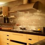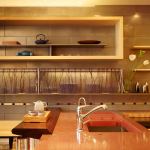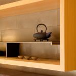 “I like the simplicity of modernism, but prefer a bit more comfort,” says designer Fu-Tung Cheng of balancing modern with handcrafted. And so it is with this San Francisco kitchen. The cooktop area, a mix of sleek and warm, is a modern-day hearth that anchors the room. Ceramic tiles with a metallic glaze produce a backsplash with texture and depth. Recessed insets, each a tiny glass mosaic, interrupt the grid of the backsplash, adding a handmade feel. The hood, designed by Cheng, is a quarter-ellipse with a graceful style that many vent hoods lack. Ample counter space leaves room for prep work and appliances, while display shelves make space for the homeowner’s tea sets. Gaps in the bamboo storage drawers serve as pulls, adding visual relief that keeps the drawers from looking boxy. “Boxing things up in the kitchen is a mid-century ideal of sanitation,” says Cheng, preferring the unlikely examples of hoosier cabinets and country kitchens, whose casual openness he finds friendly.