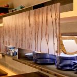 Perpendicular to the cooktop area are the sink and drainboard. The red surface is made of Geocrete, one of the trademarked concrete blends that Cheng is known for. The concrete slopes gently to meet the walnut shelf, preventing water from pooling or from seeping into the joints.