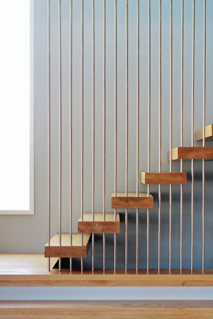 The stair treads are thick slabs of maple that appear to float. But they don’t: The treads are anchored by fasteners that are concealed in the wall (there’s actually a ½-inch gap in between tread and wall). The stair treads seem to be pierced by delicate stainless rods. But they’re not: The rods are aligned precisely above and below the treads, joined by couplings inside the stair tread. In order to avoid torquing over time, the treads consist of laminated boards, with the grain going in different directions. This staircase may look delicate, but it’s solid. “Those rods are actually carrying the stair,” says architect Mahdad Saniee. “Every element has a purpose,” he adds. “That’s the difficulty with modern details—there’s nothing to hide behind.”