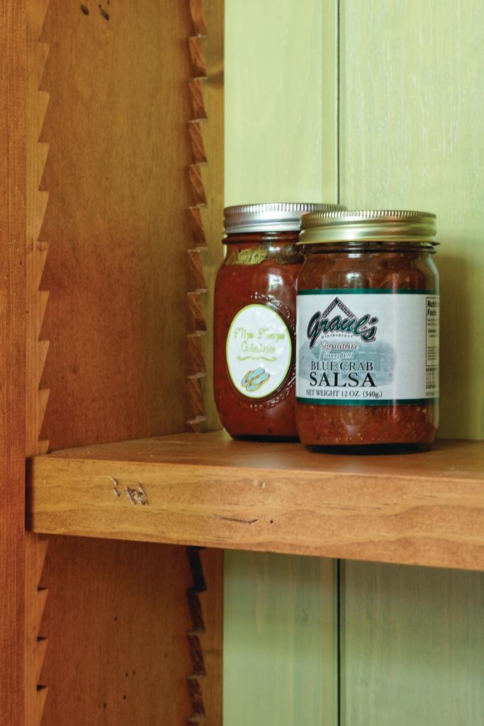 Vintage armoires provided the inspiration for the handcut, ratcheted shelving detail in this kitchen pantry, which came to life with a few napkin sketches and a table saw. The movable shelving was cut from the same Eastern white pine used on all the interior trim in the house.