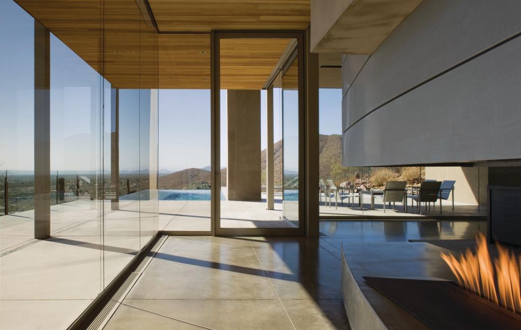 Situated in the Arizona desert, this modern home serves as an extension of the landscape that surrounds it. Its neutral palette of materials—glass, concrete, and metal—are fashioned into horizontal planes that echo the stratified environs. Naturally, for a space this hip, not just any fireplace would do.