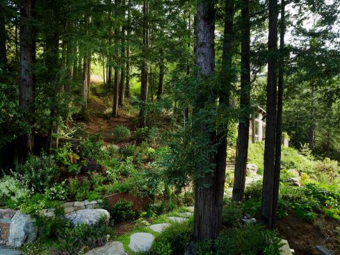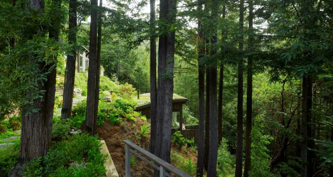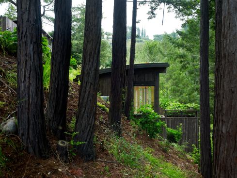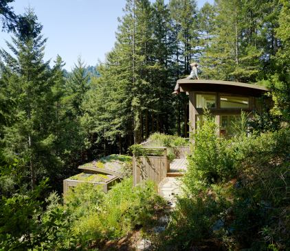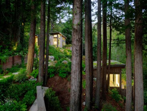 The designs mimic the forest, with upright wood siding echoing the surrounding redwood and pine tree trunks, topped by planted roofs that evoke the forest canopy. And thanks to the site’s steep slope, which mandates a verticality for the buildings, the structures’ shape adds to the illusion.
