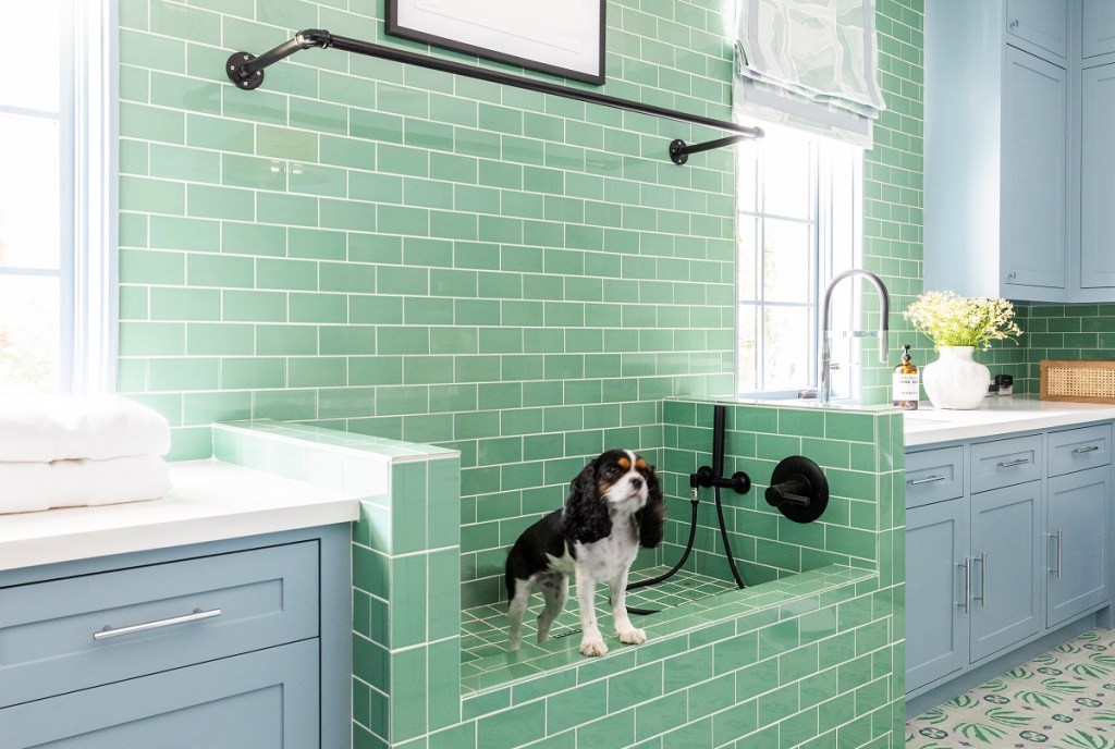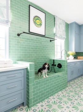 Houston-based builder Thompson Custom Homes with designers Robert Dame Designs and Creative Tonic Design completed Wilding 3, a custom home for a large family and its canine members. In addition to the standard appliances, utility sink, and storage areas, the home’s oversized laundry room includes its own dog bath. Raised up from the floor, but below countertop height, the soft green-tiled area with black hardware sits on the central wall between two windows and allows the owners to wash their dogs with ease.