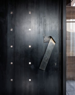 Made of 4 millimeters of blackened stainless steel on the exterior and 4 millimeters of hot rolled and blackened steel on the interior, the door is punctured with 1-inch square holes that are glazed with insulated glass. The openings create small port holes to allow light to filter through from the opposing window wall in the living room.