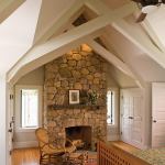 Soaring ceiling, exposed trusses, and stone fireplace give the master bedroom a sense of presence and solidity.