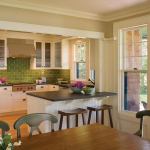A glass tile backsplash and integral sinks made of concrete add a contemporary touch that makes sense in this shingle-style house.