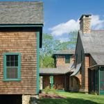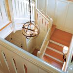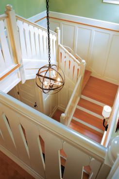 The house wears its influences well: The shingles say eastern seacoast, and the gambrel roof is a reminder that a farm was once here. There’s an Arts and Crafts influence, too, with oversized roof brackets that add a playful flourish and details such as the staircase that’s built in a tower the same height as the rest of the house. On the inside, corner windows let light pour into the stairwell while wainscoting adds depth and definition. The stair rail is made of poplar, a hard wood that takes paint well. The rail’s cutouts add lightness and help daylight travel through the stairwell. It’s also a simple way of giving dimension and gracefulness to a staircase without the kind of elaborate carving you’d find in a more formal house. The interior actually has a fair bit of wood trim, but like the stair rail, it’s all accomplished with an impressively light hand.