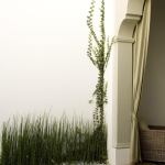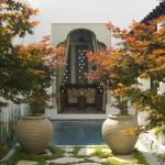 In this alfresco retreat, landscaping takes on a role as important as fixtures and finishes inside the house. The joints between Dominican shellstone pavers are planted with Dichondra to create a mossy carpet, while additional plantings of horsetail, climbing English ivy, and Japanese red maple provide complementary textures to beach pebbles, whitewashed walls, and Moorish tile work.