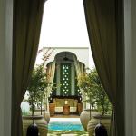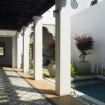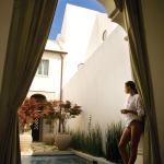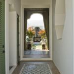 Oriented along two axes, each intimate space has its own distinct flavor and natural light gradation. From the street, 11-foot wooden doors open to a zaguan (open air entry hall) that is intentionally dark in contrast to the sun-drenched courtyard and plunge pool beyond. A covered gallery paralleling the kitchen, living, and dining areas is roofed in cedar purlins with a woven cane awning to filter light for a dappled effect. The gallery culminates in a 13-foot-tall, shaded alcove, which overlooks the pool through an Andalusian archway.