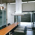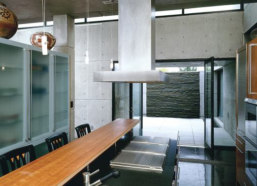 Under foot is a post-tensioned concrete slab with 10 zones of hydronic heat. Where the slab was left exposed, the concrete was polished, stained, treated with an acrylic sealer, and waxed. Ceilings and furred-out interior walls are pigmented plaster with a diamond finish that looks like machined stone. “The finishes are very simple inside,” Anderson says. “The concrete comes right down and hits the floor.” Against this monolithic backdrop, accent materials stand out in bold contrast: agave plants in a stepped planter near the entry, polished stainless steel doors at the courtyard gate and entry, a 10-foot-high water wall of saw-kerfed black granite, a cherry paneled den. But none of them steals the show. In this house, concrete is the main attraction.
