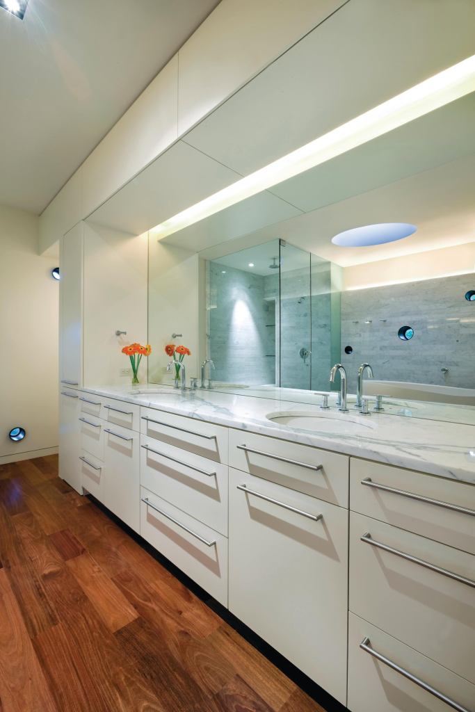 The drain is a necessary evil in a bathroom. Round, perforated, and omnipresent, it’s a nuisance but nonetheless vital. For this Austin, Texas, bathroom, Alterstudio found a clever way to keep its function while making it less conspicuous. “It’s a stainless steel pan that’s dropped down about 3 inches,” architect Kevin Alter says. “It still has a regular round drain, but it’s covered with smooth river rocks.” There is a slight slope to promote drainage, and, the architect adds, the whole setup is easy to clean.