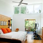 Inside, the glass-clad front gable provides natural light to the open floor plan’s kitchen, living, and dining areas. Locally sourced, reclaimed heart pine floors and salvaged wood from an old shed on the lot further connect the house to its site. Large windows provide natural lighting as well as passive solar heating in winter months.