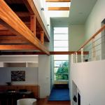 The house perches on a forested slope high above the town of Point Reyes Station, Calif. Rather than make a deep cut into the steep hillside and place the house on a flat surface, Swatt opted to step the five-level building down the slope atop a pier and grade beam foundation. This method preserves one of the most obvious reasons for owning a Northern California vacation home in the first place: the majestic Douglas fir trees that tower 150 to 200 feet above the ground. “The trees have enormous root systems,” he says. “We don’t want to weaken those, so we didn’t really want to have retaining walls.” The five-layered floor plan also created the ability for at-grade exits to the outdoors from every major space. The guest bedrooms, master bedroom, living/dining room, and kitchen each open directly onto a patio. “It’s a nice thing to have a connection to the land that way,” says Swatt. An additional large terrace can be reached by a set of stairs off the central circulation spine. Swatt and Stept lined most of this spine with windows, turning it into an interior and exterior focal point.