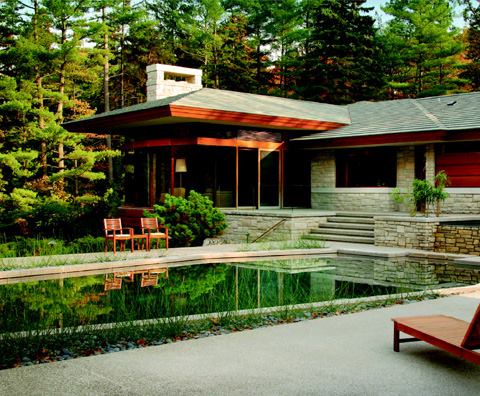 The client’s wish for this sloping property in Bloomfield Hills, Mich., was simple: a Frank Lloyd Wright-inspired home with harmonizing outdoor spaces where he could entertain easily. But there was one complicating factor: an existing coffin-shaped pool that, for budget reasons, had to stay. It was the pool’s location near the top of the site’s slope that posed the biggest challenge.